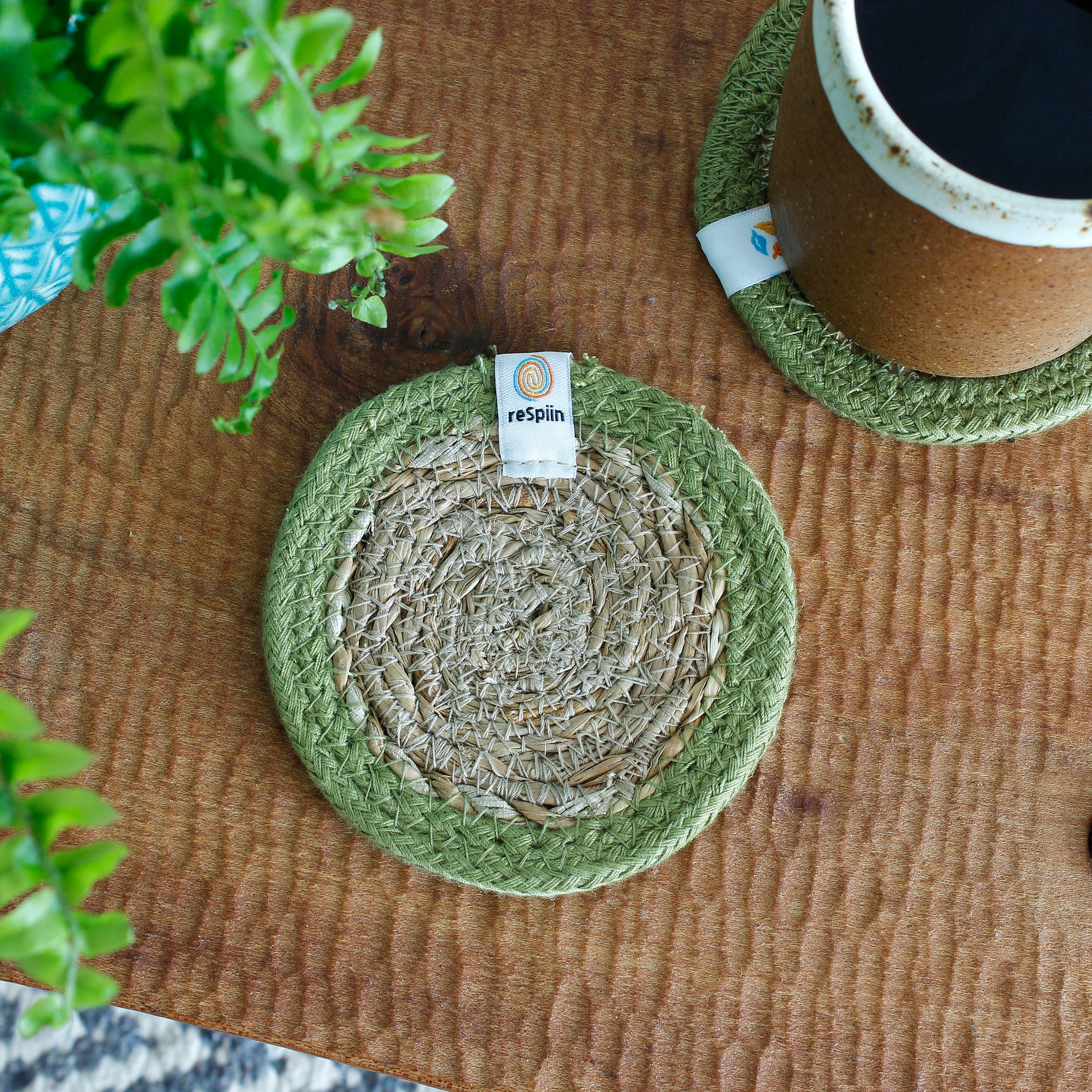 Made from sustainably sourced seagrass and jute. Coloured with non-toxic dyes and tested safe for food contact. Each coaster has a small fabric ReSpiin label stitched onto the edge.