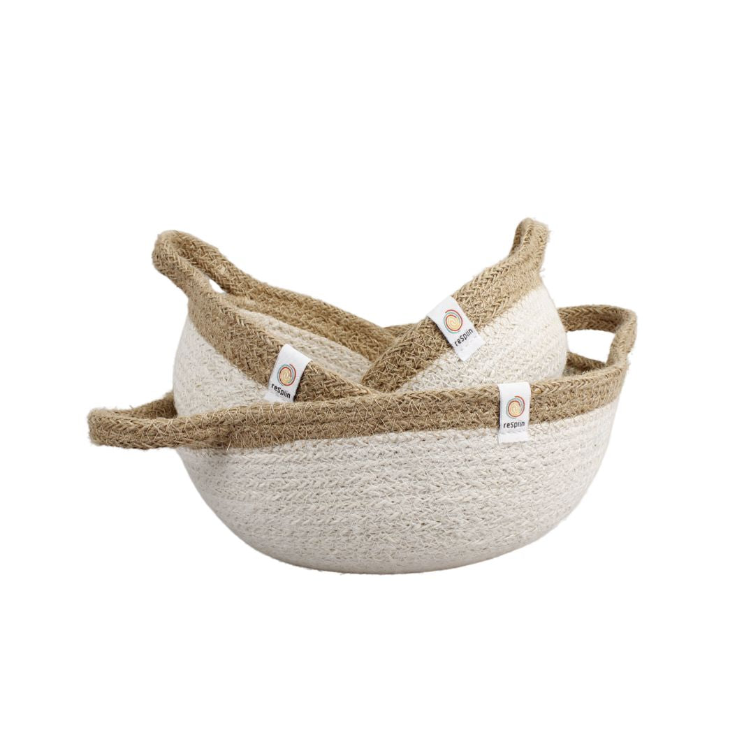 These hand-crafted Jute Handled Bowls come in a set of three, featuring a soft and rounded design. The integrated handles add both functionality and aesthetic appeal to these beautiful bowls. Perfect for use in the kitchen or as a decorative piece in any room of the house.