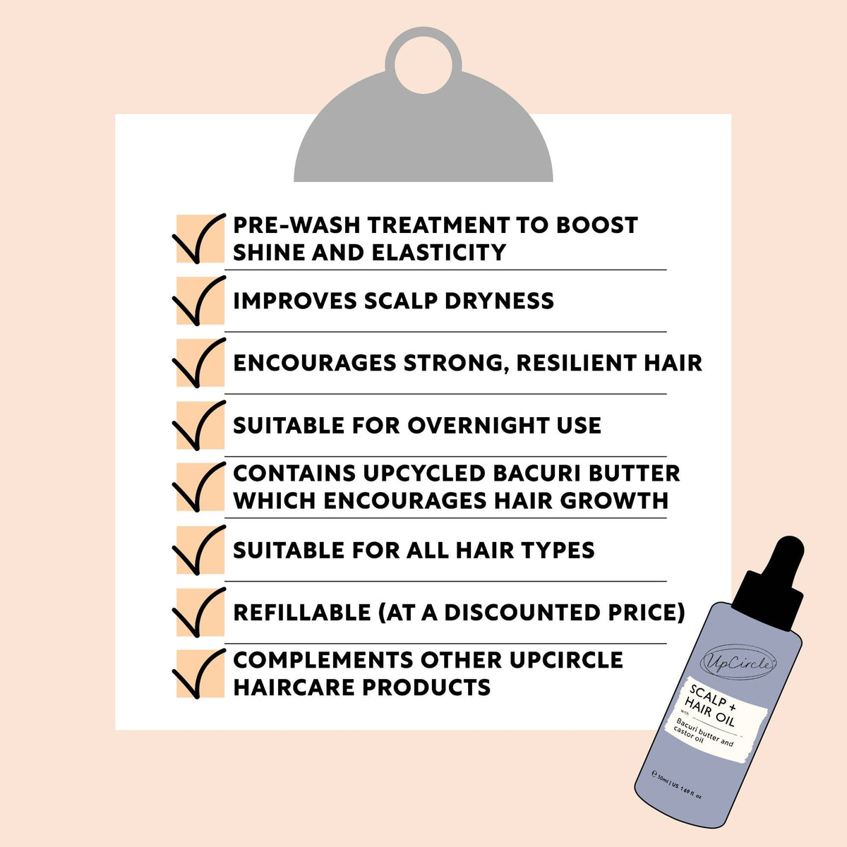 Introducing one half of UpCircle's newest haircare additions... the restoring Scalp + Hair Oil! Formulated with upcycled Bacuri Butter, enriched with fatty acids to leave hair & scalp feeling revived. Use as a pre-wash treatment for long-lasting shine, or as a post-wash hydration boost.