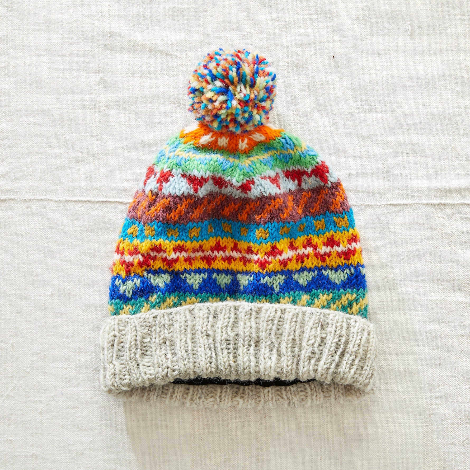 Stay warm in style with this unisex hand-knitted wool hat, crafted from 100% wool with a soft cotton jersey-lined brim for added comfort. Finished with a playful pompom bobble top, each hat is one of a kind, made from ethically sourced waste wool โ€” giving new life to leftover materials.