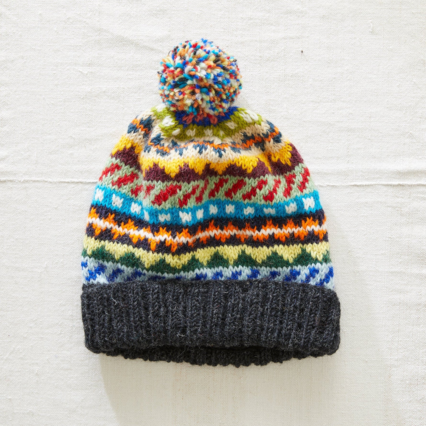 Stay warm in style with this unisex hand-knitted wool hat, crafted from 100% wool with a soft cotton jersey-lined brim for added comfort. Finished with a playful pompom bobble top, each hat is one of a kind, made from ethically sourced waste wool โ€” giving new life to leftover materials.